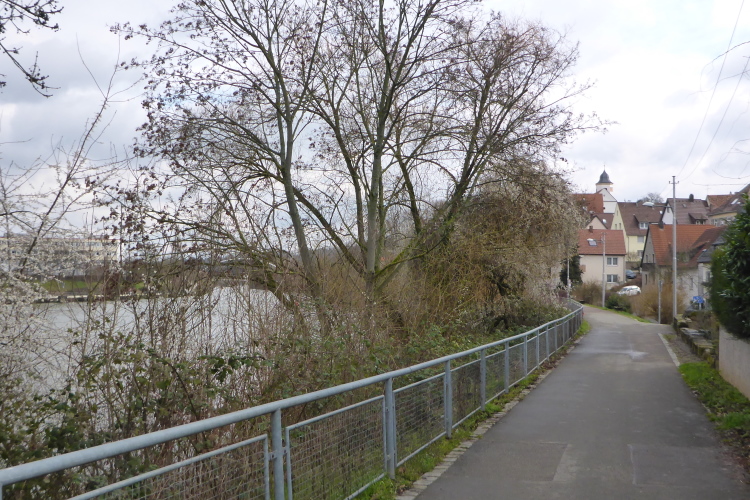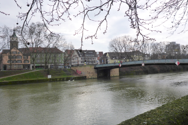 Hier herrscht Natur pur. Rechts liegt der Oeffinger Scillawald, benannt nach den wunderschönen kleinen Blausternchen, die im Frühjahr hier zuhauf blühen. Die ersten sind bereits zu sehen. Seit 1981 ist er ein sogenannter Schonwald, wo selbst Totholz liegen bleiben darf. Um den Wald eingehender zu besuchen, müssten wir bei der Einmündung des Weidachtals scharf rechts. Leider würden wir so die Laufstrecke verlassen. Stattdessen bewundern wir die Fellbacher Landungsbrücke, die im Rahmen des Projektes Landschaftspark Neckar erbaut wurde. Es handelt sich um eine Brücke, die sechs Meter über dem Wasser einfach aufhört. Dieses 24 m lange begehbare Kunstwerk soll für den Besucher neue Ausblicke auf das hier renaturierte Flussufer schaffen. Wir wundern uns und genießen den freien Blick aufs Wasser und das gegenüberliegende Ufer von der Strecke aus.