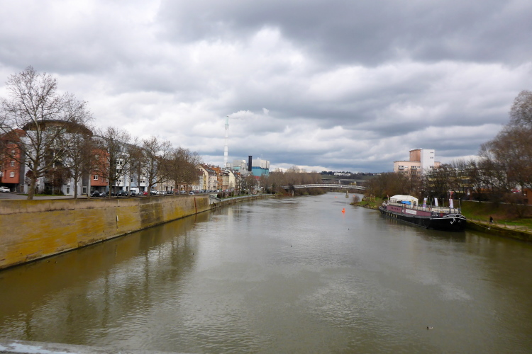 Schade, dass wir die schönen Gassen mit seinen historischen Gebäuden nur erahnen können. Wir bleiben auf dem Radweg und laufen am Neckar entlang. Hier liegt das Theaterschiff „Frauenlob“. Als Binnenschiff für den Futtermitteltransport 1930 erbaut, wurde das 67m lange und 8m breite Schiff 2007 zum Theaterschiff für 156 Gäste umgebaut. Komödiantische Eigenproduktionen sowie Kabarett und Kleinkunst begeistern seitdem die Zuschauer.