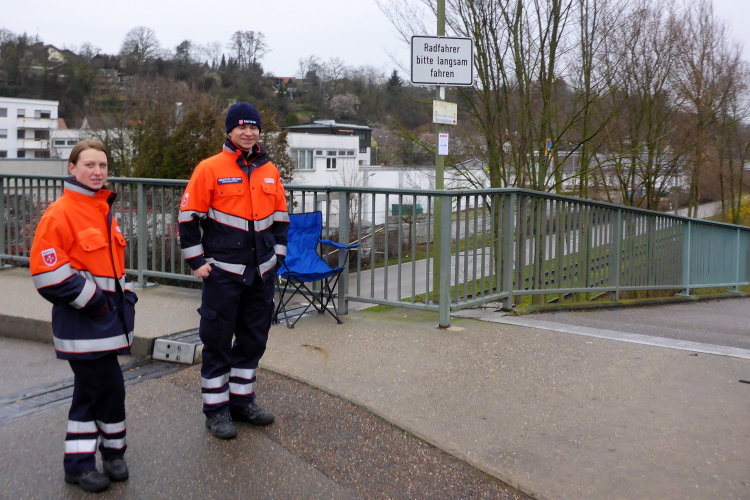 Der Neckar kommt nun direkt an den Radweg heran. Somit haben wir freien Blick auf Aldingen, das am anderen Ufer liegt. Vor uns sehen wir jetzt die Staustufe. Sie besteht aus einer Schiffsschleuse mit 2 Kammern, einem Kraftwerk und einem Wehr. Außerdem dient sie als Autobrücke. Bevor wir sie erreichen, geht es noch ein kurzes Stück auf dem Gehweg an einem Industriegebiet vorbei. Dann biegen wir scharf links auf den Übergang. Weil gerade kein Auto kommt, können wir auf der Fahrbahn laufen. Auf der anderen Seite der Brücke erwartet uns die erste VP. Der Helfer notiert unsere Nummern und die Sanis kontrollieren, ob es auch allen gut geht.