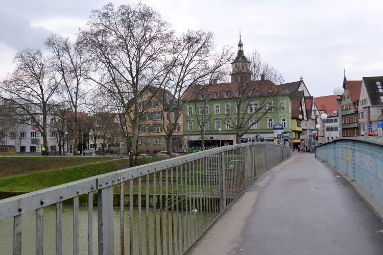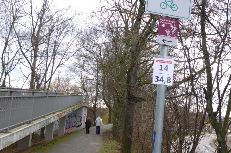 Hört sich kompliziert an? Ist es aber nicht. Wenn man nur ein wenig aufpasst, dürften keine Probleme entstehen. Um kurz nach 9 Uhr geht es los. Das Wetter ist optimal: ungefähr 5 °C und bewölkt. Es geht kurz am Ufer des Neckars entlang, dann unter der Hofener Brücke hindurch auf den Neckarradweg. Mit den letzten Häuser von Hofen rechts verlassen wir bewohntes Gebiet. Schnell erreichen wir den Vier-Burgen-Steg, eine imposante Stahlkonstruktion, die Fußgänger und Radler schnell über den Neckar bringt. Wir lassen die Brücke links liegen und bewegen uns weiter den Fluss hinunter.