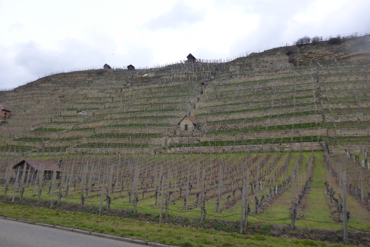 Wir sind froh, dass wir die Blechlawine hinter uns lassen können. Zwischen Neckar und den Weinbergen des bekannten Cannstatter Zuckerle laufen wir weiter. Schon von weitem sticht uns, am Fuße der Weinberge, eine hohe, senkrechte auffallend braune Wand ins Auge. Es handelt sich um eine Lösswand, bestehend aus feinen Plättchen aus Quarz, Feldspat, Glimmer und Kalk, was die Steilwand so besonders standfest macht. Bereits in der Jungsteinzeit nutzten die Menschen Löss zum Verputzen der geflochtenen Wände ihrer Hütten. Der imposante Lössaufschluss an der Austraße wurde vor einigen Jahren von der Stadt Stuttgart als Naturdenkmal ausgewiesen. Er ist Bestandteil des Geologischen Lehrpfads von Bad Cannstatt und Münster.