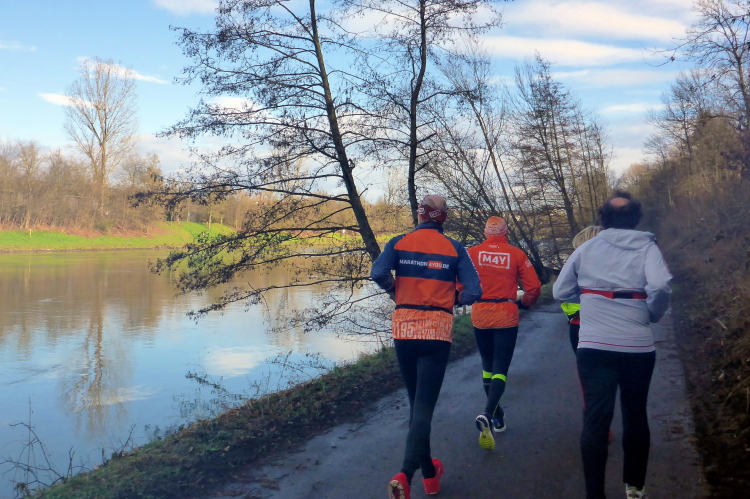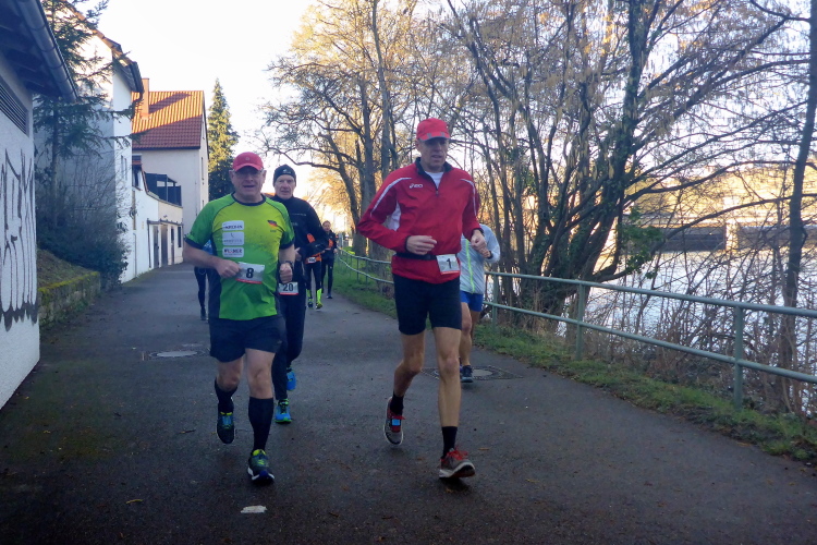 Der Start- und Zielbereich hat sich inzwischen gut gefüllt, obwohl aufgrund der momentanen Grippewelle einige Teilnehmer kurzfristig absagen mussten. Ein greller Pfiff lässt plötzlich die Gespräche verebben. Michael ruft zum Start. Jeder hat seinen Platz in der Startaufstellung schnell eingenommen. Man merkt, dass hier kaum Neulinge am Start sind. Jeder weiß sich richtig einzuschätzen und einzuordnen, so dass auch pünktlich um 9:00 Uhr der Startschuss fällt. Die sechste Ausgabe des Neckarufer Marathons ist gestartet. Nach dem kurzen Gewitter vom Vortag ist es heute trocken und soll auch während des gesamten Laufs so bleiben. Lediglich gelegentliche Böen werden das Laufen etwas mühsamer machen.