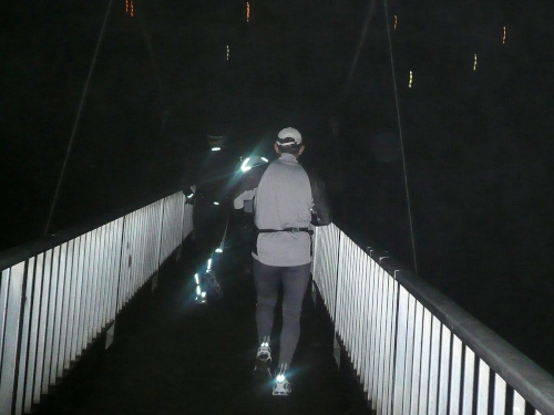 Jetzt ist es doch ein einmaliger, tranceartiger Augenblick. Wie Speedboote wetzen wir durch die schmale Gasse, links und rechts Fackeln, Wunderkerzen, über uns Raketen und viele Lichter. Ein Gemisch aus Pulverdampf, Nebel und Atemluft macht die Sicht schwierig. Diese meine ersten Momente von 2010 sind schwer zu beschreiben, ich war viel zu weit vorne und viel zu schnell, aber ich war wieder dabei, wenn auch in einem sehr eigenartigen Rauschzustand. Wie der Gott der Fledermäuse, so flog ich schwerelos am Ufer der Limmat entlang, wie weisse Schminke so flog mir im Schein der Stirnlampe der Atemnebel der Läufer entgegen. Am anderen Ufer taucht die Fahrradlampe auf, die den Spitzenläufer ankündigt.