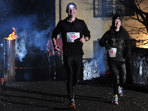 Eigentlich reicht mir das Streulicht aus dem Siedlungsgebiet aus, um den Weg zu erkennen. Dort, wo der Naturweg etwas gar gut hydriert ist, spielt es auch keine Rolle, ob man durch die Pfütze auf dem Weg läuft oder durch den Matsch nebenan. Die wenigen Wurzeln, über welche man stolpern könnte, sind zudem mit Neonfarbe markiert, sind also auch bei relativer Dunkelheit gut zu erkennen. Ein Großteil der anderen Teilnehmer hat ihre Stirnlampen aber eingeschaltet, was beim Blick auf die andere Uferseite einen besonderen Reiz ergibt. Die Schnellen bewegen sich wie eine Kette von Glühwürmchen flussabwärts. Nach dem Überqueren des Fußgängerstegs ist es dann das nachfolgende Halbmarathonfeld, das auf der anderen Seite für die Lichterprozession sorgt.