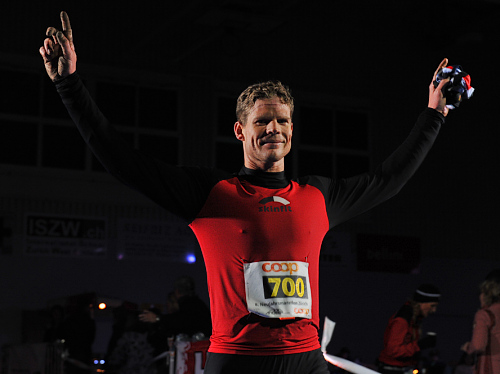 Eigentlich ist ein Zieleinlauf mit dieser Zeit nichts Spektakuläres. Aber dem Eintreten in die Halle und den letzten Meter auf dem blauen Teppich bis zum Zielbogen verleiht die stimmungsvolle Lichtgestaltung etwas Triumphales. Das Organisationsteam rund um Roger Kaufmann hat sich überhaupt große Mühe gegeben, der Halle ein festliches Ambiente zu verpassen. Auf diese Weise hatten auch Angehörige einen angenehmen Rahmen, um in dieser besonderen Nacht auf die Rückkehr ihrer Liebsten von der vom Mythos umrankten Laufdistanz zu warten.