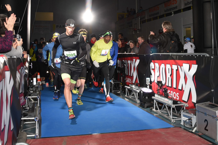 Meine Startnummer erhalte ich umgehend, zusammen mit einem gut gefüllten Goody-Bag. Ich geselle mich zu den vielen anderen Teilnehmern, welche mit ihrer Sporttasche bereits auf den Tribünenrängen Platz genommen haben und lausche dem babylonischen Sprachgewirr. In bestem Deutsch hiesiger Mundart werde ich angesprochen und mit Lob für die Arbeit von Marathon4you bedacht. Noch befinden wir uns im alten Jahr, doch ich nehme das buchhalterisch als Transitorische Aktiven ins umgehend anbrechende.