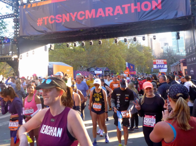„Jetzt sind wir da“, denke ich. Aber Vorsicht, es sind noch rund 5,5 km zu laufen! Dazu geht es sogar noch etwas hoch und runter. Die Menschenmenge ist unüberschaubar. Links und rechts der Strecke Zuschauer in mehreren Reihen, in der Mitte der Läuferstrom. Gänsehaut. Es geht am Südende nochmal raus aus dem Central, am altehrwürdigen Hotel Plaza vorbei, um dann am Columbus Circle wieder einzubiegen. Es folgen die letzten 800 m bis zum Ziel beim Tavern on the Green.