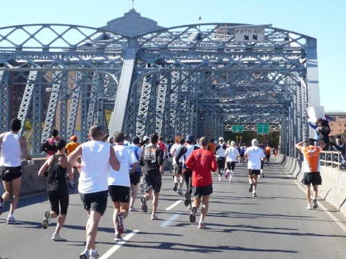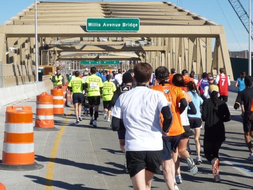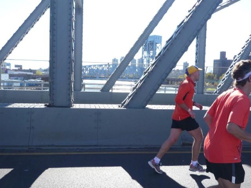 Etwa bei km 32 erreichen wir das nördliche Ende der First Avenue. Der Anstieg zur nächsten Brücke und der Zugang zum letzten borough unserer New York Lauftour steht an. Die Bronx erwartet uns. Die Willis Avenue Bridge über den Harlem River war früher berüchtigt für ihren Gitterboden und die darauf ausgelegten, unangenehm zu belaufenden Teppiche. Nach Renovierung ist die Brücke aber nunmehr asphaltiert. Nur der unvermeidliche Anstieg kostet weiter Kraft.
