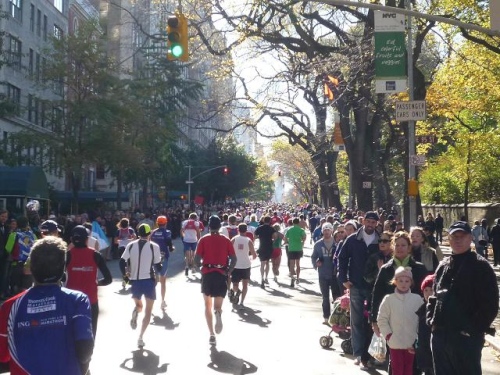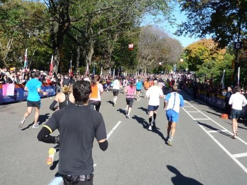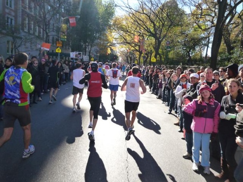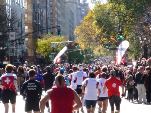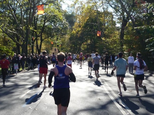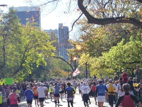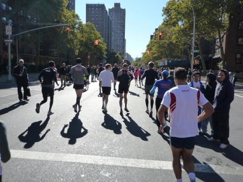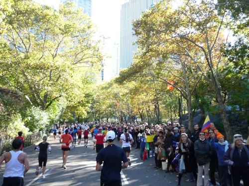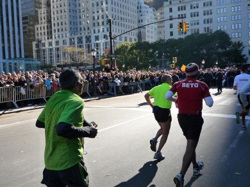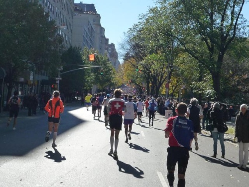 Und wieder geht es über Kilometer weitestgehend geradeaus. Je weiter wir in Richtung Süden vorstoßen, desto größer werden die Häuser, wohlhabender wirkt das Umfeld und dichter werden die Zuschauerreihen. Richtig schön wird die Strecke, als wir das Nordende des Central Parks erreichen und an dessen Ostseite entlang laufen. Selten passt der Begriff „grüne Lunge“ so wie auf diese 340 Hektar messende, riesige Grünfläche im Herzen Manhattans. Der Park selbst ist mit seinen Spazierwegen, weiten Wiesen, Bäumen, Teichen gerade jetzt und heute, wo der Herbst sich von seiner goldenen Seite zeigt, besonders idyllisch – geradezu spektakulär wird er im südlichen Teil jedoch durch die Szenerie der ihn umrandenden und überragenden Wolkenkratzer.Hohe Bäume, deren herbstlich verfärbtes Laub im Sonnenlicht erstrahlt, säumen die Straße. Immer mehr verengt das Spalier der Zuschauerreihen die Lauftrasse, was so etwas wie ein Alpe d’Huez-Feeling aufkommen lässt.