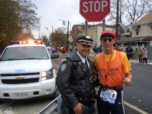 Es geht nun hinein auf die 92th Street. Die ersten Zuschauer auf der linken Seite sind zwei Police Officers. „Welcome in Brooklyn“, werde ich mit Handschlag begrüsst, da ich ein gemeinsames Bild will. Mit einem „A great race“ werde ich dann weitergeschickt.