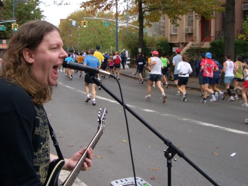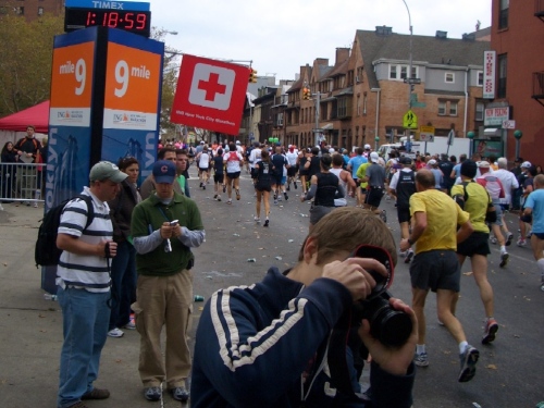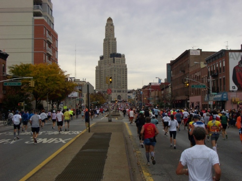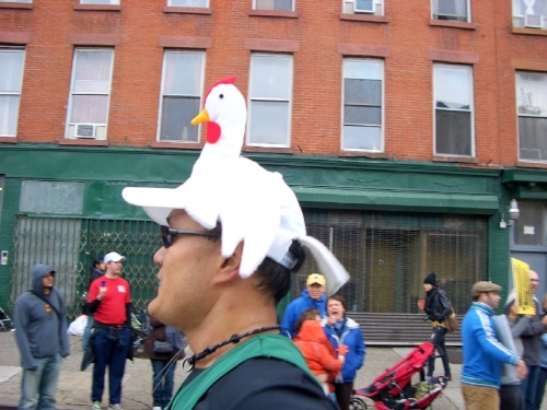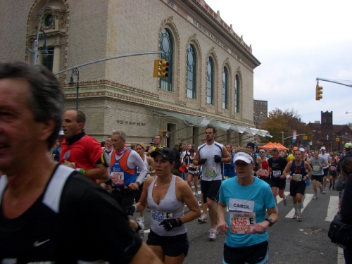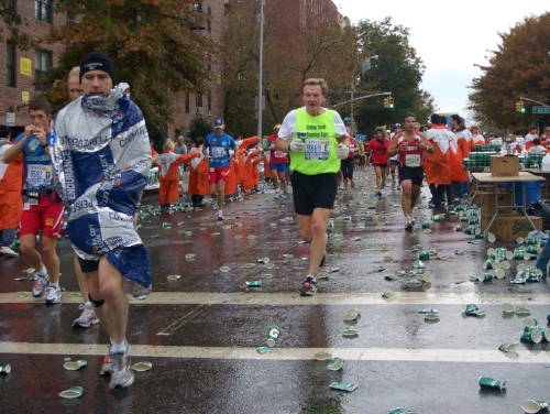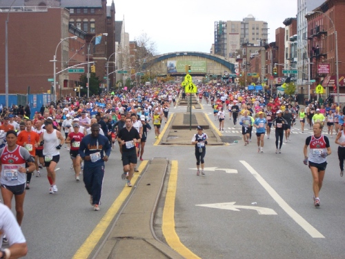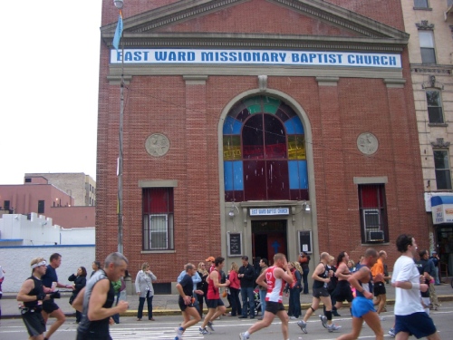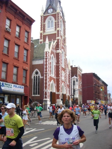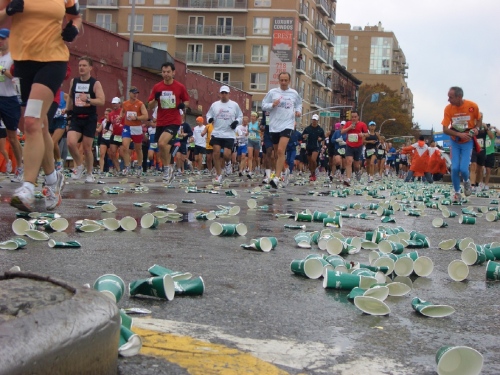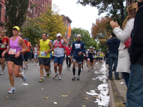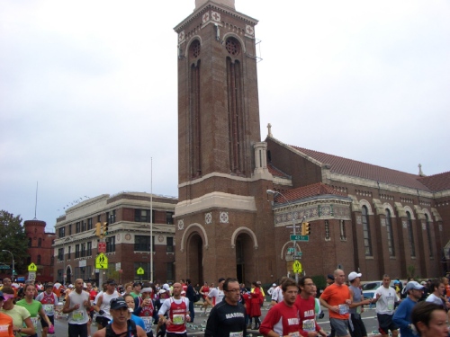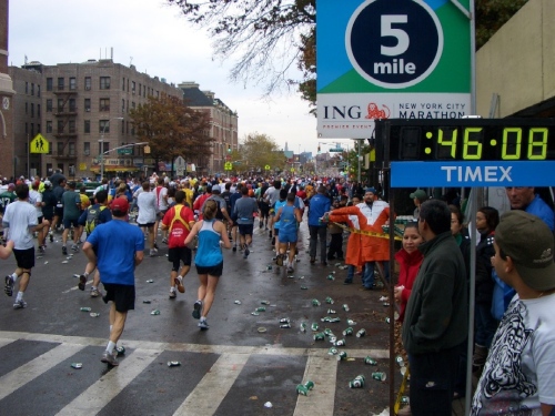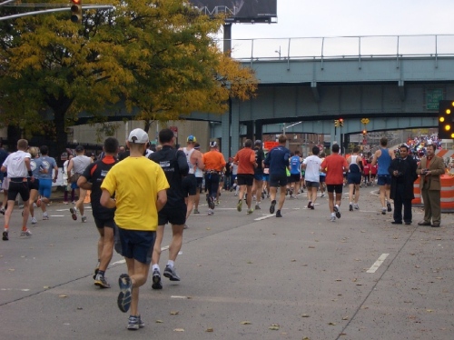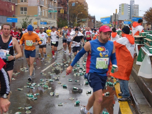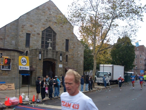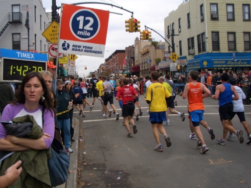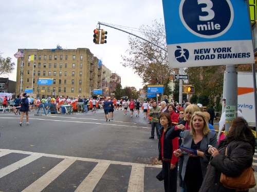 Meile drei, Bay Ridge. Bei einem Musiker sehe ich schon eine rote Nikolausmütze. Ja, is denn scho wieda Weihnachten? Verpflegungsstelle mit Gatorade und Wasser schließt sich an. Verdursten muss hier keiner, denn alle ein bis zwei Meilen gibt es da die Tankstellen. Es reicht dicke, zumal die Temperatur heute keine Sprünge nach oben machen wird.