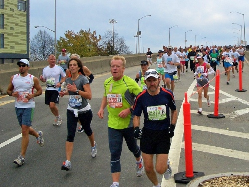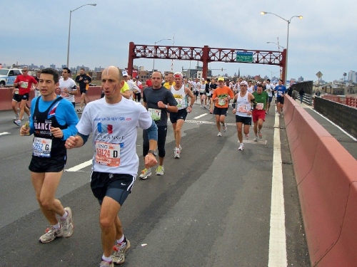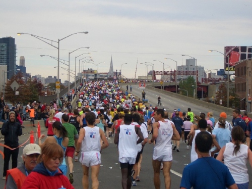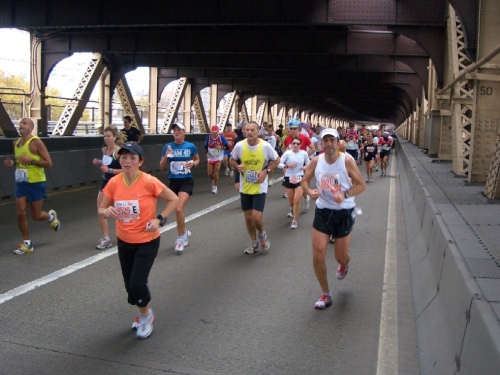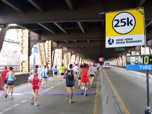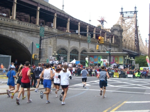 Die Queensboro Bridge verbindet Queens und Manhattan. Auch hier warten zahlreiche Höhenmeter. Viele Läufer sind schon in den Wanderschritt gefallen. Vom Anstieg her ist diese Brücke fast mit der Verrazano Bridge vergleichbar.