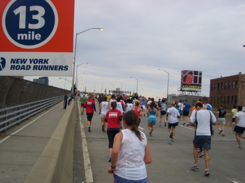 Meile 13, die zweite Brücke wartet auf uns. Wieder stellen sich zahlreiche Höhenmeter auf der Pulaski Bridge dem Läuferfeld entgegen. Etwa am Scheitelpunkt der Brücke ist die Hälfte des Marathons geschafft und es geht nach Queens hinein. Ein Veteran spielt auf einer „Quetschn“. Kurz danach gibt es Rock von der Gruppe Sosnyc. Gut zwei Meilen lang durchlaufen wir Long Island City und die 49th Street.
