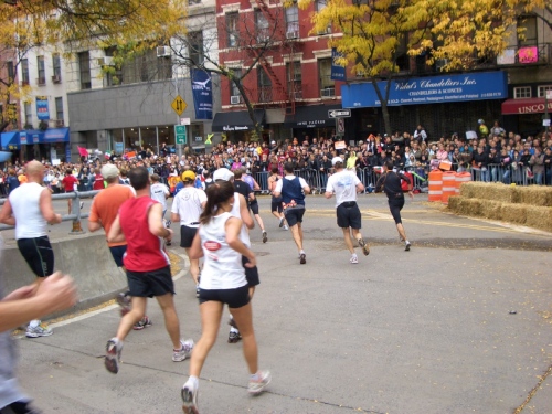 Dann geht es mit Schwung bergab nach Manhattan hinein. Scharfe Linkskurve, an der Seite liegen Strohbüschel, falls einer die Kurve nicht kriegt, dann stehen die Zuschauer hinter den Absperrungen in mehreren Reihen.