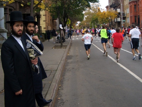 Nach 90 Minuten Laufzeit sind wir im Judenviertel angekommen. Eine eigenartige Stimmung. Während uns die Farbigen weiter wie gewohnt anfeuern, schauen die Juden einzigartig aus. Schwarzer Anzug, weißes Hemd, Melone, langer Bart. Kein Lächeln kommt denen aus. Wahrscheinlich gehen die zum Lachen in den Keller. Einer wartet gar vor dem Zebrastreifen, auf dass das Läuferfeld stoppt, um ihn über die Strecke zu lassen. Ein Cop pfeift ihn zurück.