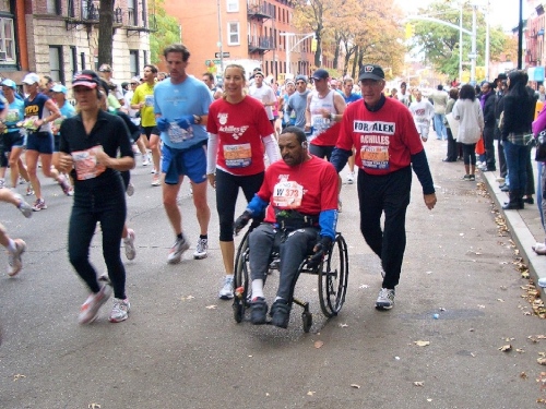 Nach 46 Minuten habe ich fünf Meilen zurückgelegt. Deutet immer noch eher in Richtung vier Stunden hin. Bis Meile acht ist unser Kurs weiterhin auf der 4th Avenue. Kurz nach dem Meilenschild überhole ich den ersten Rollstuhlfahrer, den von zwei Guides begleitet wird. „For Alex“, ist auf einem Shirt eines Begleiters zu lesen.