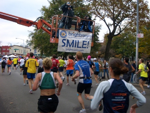 Kurz vor Meile zwölf werden wir von einem professionellen Team aufgefordert zu lächeln. SMILE ist auf einem Transparent zu lesen. Viele Läufer reissen die Arme hoch. Gut 100 Minuten bin ich jetzt unterwegs.