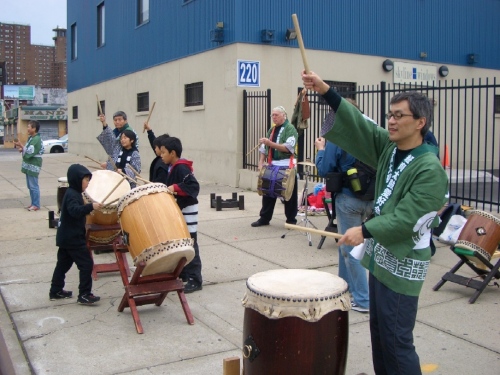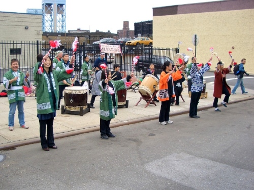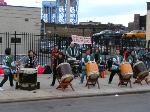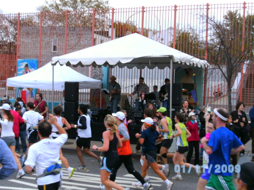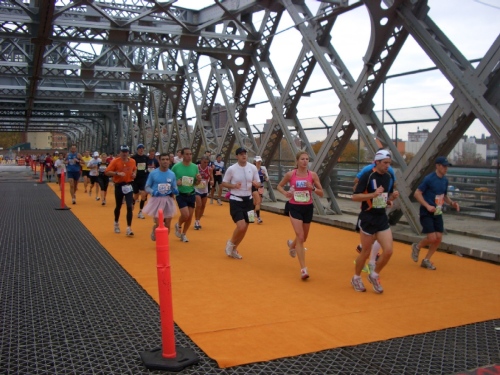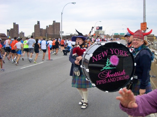 Am Ende der 1st Avenue, in East Harlem, geht es abermals hoch. Wir überlaufen auf der Willis Avenue Bridge den Harlem River. Es sind zwar nicht mehr viele Höhenmeter, aber was uns zu schaffen macht, das ist der orangefarbene ausgelegte Teppich. Der bremst und kostet Kraft. Wer daneben laufen will, kann durch die Gitterroste auf Gewässer nach unten schauen. Auch nicht jedermanns Sache. Am Ende warten die New York Scottish Pipes And Drums.