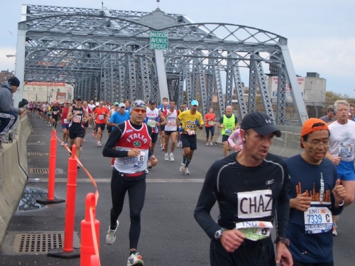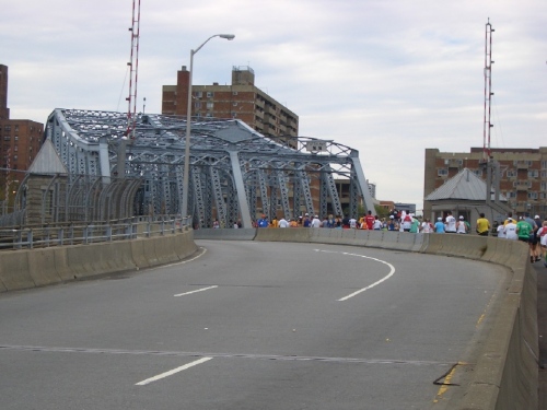 Letzte Brücke, die Madison Avenue Bridge, noch fünf Meilen, rund acht Kilometer. Ich überhole die ersten 3.30 Stunden-Pacer. Überschlagend brauchen die doch deutlich über 3.30 Stunden, so meine Feststellung. Haben die vielleicht zu schnell begonnen?