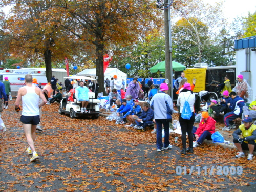 Dann schwenkt die Strecke halbrechts in den Park. Nach zwei Minuten steht eine Mädchentanzgruppe auf der linken Seite. Raus mit der Kamera! East Drive, noch knapp zwei Meilen. Immer weitere Wellen im Park, hört denn das nicht mehr auf?