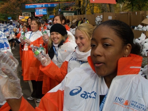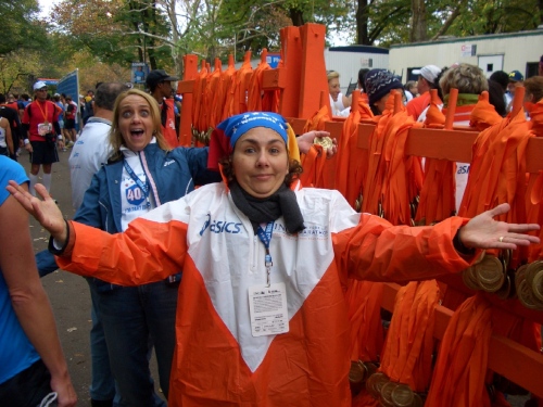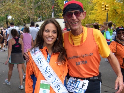 Ich sehe am Rand die Miss New York stehen. Die brauche ich jetzt für mein persönliches Finisherbild. Für einige Aufnahmen bleibe ich noch im Zielbereich, dann schickt man mich weiter.