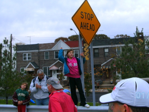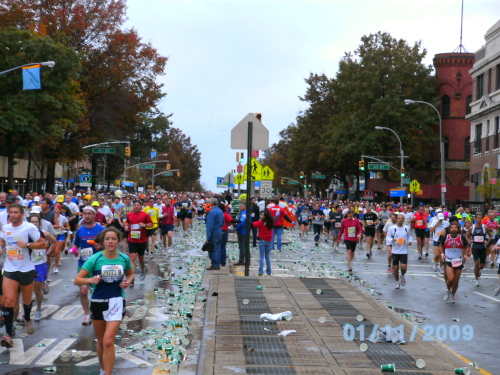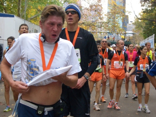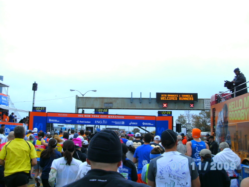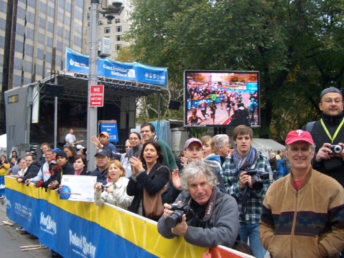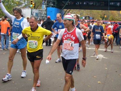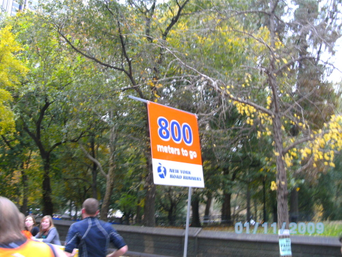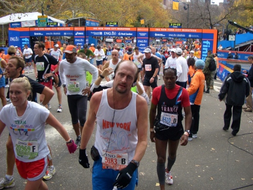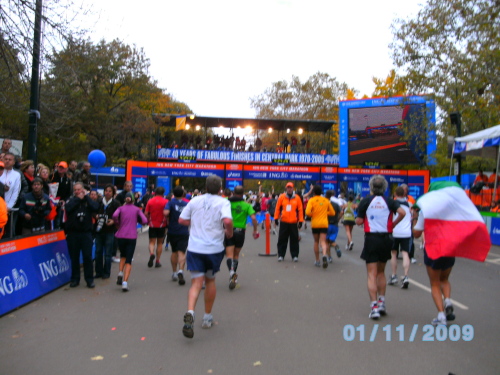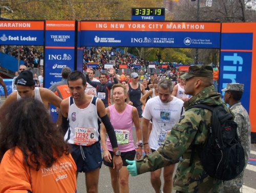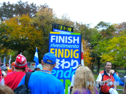 Dann sehe ich bereits die Statue von Christoph Columbus auf dem Columbus Circle. Wieder hinein den Central Park. Letzte Entfernungsschilder, Endspurt. Und hoch zum Ziel beim Tavern On The Green. 3.33 Stunden brutto zeigt die Uhr. Hat es gereicht für sub 3.30 Stunden?