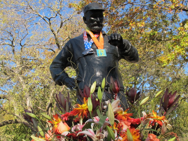 Direkt neben dem Tor steht das Denkmal für den schon erwähnten Fred Lebow, geschmückt mit Blumen und Medaillen. Bis 1993 war er der Race-Director. Als er an Krebs erkrankte, hatte er nur noch einen Wunsch: Einmal noch seinen Marathon laufen. 1992 erfüllte er sich diesen Wunsch, er lief zusammen mit der neunfachen Siegerin Grete Waitz. 1994 starb er.