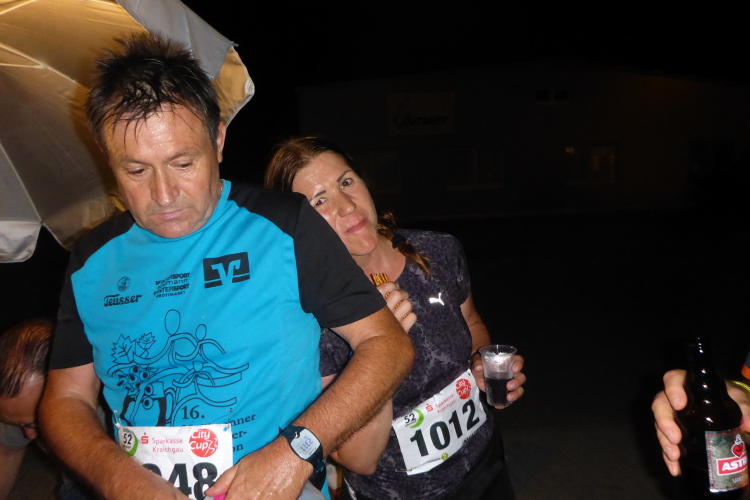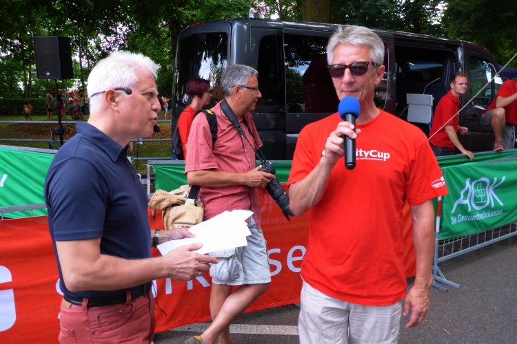 Mit besten Wünschen versehen, zieht es uns nach draußen. Auf der Straße vor dem Sportplatz unter dem großen Startbanner gehen gerade die Schülerläufe zu Ende. Die erhitzten Kids nehmen den Applaus der stolzen Eltern gerne entgegen. Im Rahmen des etablierten Kraichgau City Cups werden 800 bzw. 1600 m-Läufe für Schüler, ein 5 km Lauf, auch für Walker, und der 10 km Lauf angeboten. Dementsprechend ist einiges los.