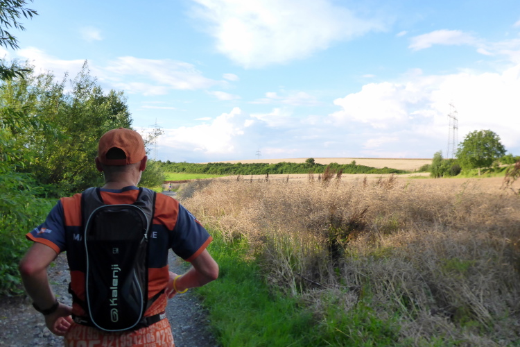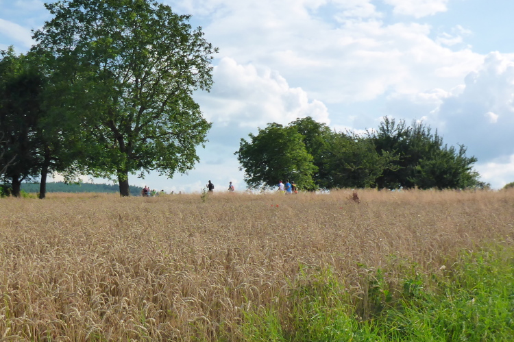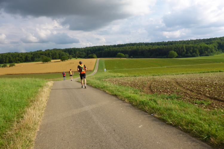 Bald liegt Bretten samt toller Weitsicht auf die Kraichgauhügel unter uns. Bergab können wir ein paar Plätze gutmachen. Erstaunlich schnell erreichen wir die erste VP im Brettener Stadtteil Sprantal bei km 7. Wir machen kurz Pause zum Kühlen und Trinken. Die Wassermelone ist heiß begehrt. Es geht erneut steil bergauf auf die Felder. Ein Meer von gelbem Korn liegt vor uns. Wellig führt der Weg auf und ab. Der nächste Ort heißt Nußbaum. Wie aus dem Bilderbuch präsentiert sich das gepflegte Dorf. Es geht erneut bergauf an der Kirche vorbei und oben rechts kurz auf der Straße entlang.