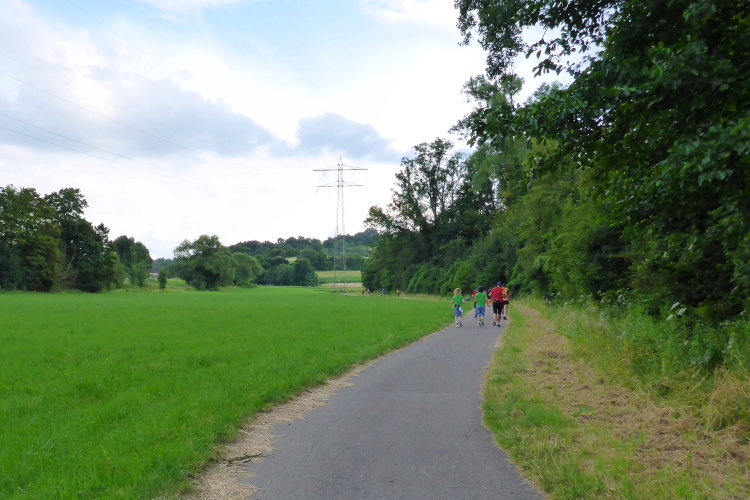 Die steinige Passage ist vorüber und wir laufen auf einem gemütlichen relativ flachen Radweg. Links liegt eine hohe Buschreihe und rechts zu unseren Füßen ziehen sich grüne Streuobstwiesen auf einen nahen Hügel. Ein Regenbogen steht am wolkigen Himmel. In der Ferne lassen hohe Wolkentürme unsere Befürchtung wachsen, dass es vielleicht noch gewittern könnte. Vor dem Bahnhof von Kleinvillars überqueren wir auf einer Brücke die Gleise und dann die Straße. Unser Weg führt nun durch weite blühende Wiesen. Versteckt zwischen Bäumen fließt das Bächlein Salzach. Hier ist es richtig schön. Und das km 20 Schild hebt zusätzlich die Stimmung.
