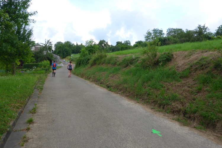 Die vielen Besucher bereiten den Ultras einen würdigen Start. Weil ich letztes Jahr hier den Zehner gelaufen bin, kenne ich die Strecke recht gut. Die Steigung Richtung Marktplatz fällt dank der Streckenverkürzung weg. Schnell finden wir uns bei der Stiftskirche wieder, wo uns Streckenposten den Weg durch die engen Gässchen weisen. Ums Neue Rathaus und in Gegenrichtung um das berufliche Schulzentrum herum, über eine große Kreuzung, die von den Begleitradlern gesichert wird, dann geht es unter der Eisenbahn hindurch. Hier müssen wir an der stark befahrenen Straße vorsichtig sein. Wir verlassen den Ort; es geht steil bergauf. Norbert wird heute die ganze Strecke mit mir laufen. Weil ich wie immer schlecht den Berg hinauf komme, sind wir schnell bei den Letzten.