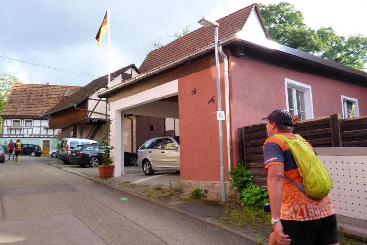 In Bauschlott erwartet uns die nächste VP. Ich lasse meine Wasserflasche füllen. Bei meinem Tempo sind mir die Abstände der VPs etwas zu lang. Es gibt leckeren Hefezopf. Ich nehme noch ein Stück für den Weg mit, dann geht es weiter. Wir befinden uns auf dem Gelände des Auenhofs. Diese anerkannte Werkstatt für Menschen mit Behinderung (WfbM) bietet im weitläufigen, ländlichen Ambiente vollstationäre Wohngruppen, ambulant betreutes Wohnen, Arbeitsplätze in unterschiedlichen internen Werkstätten, sowie die Betreuung auf Außenarbeitsplätzen an. Kinder klatschen uns ab.
