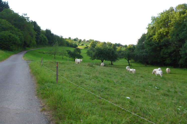 Wir biegen nach links. Hier überholen wir eine Spaziergängerin. Sie ruft uns zu, es käme nun länger keine Steigung mehr. Und tatsächlich haben wir vor uns die weite Wiesenfläche des Weissacher Tals. Auf dem gut einsehbaren Weg können wir vor uns Läufer erkennen. Das motiviert, vor allem, als wir merken, dass wir aufholen.