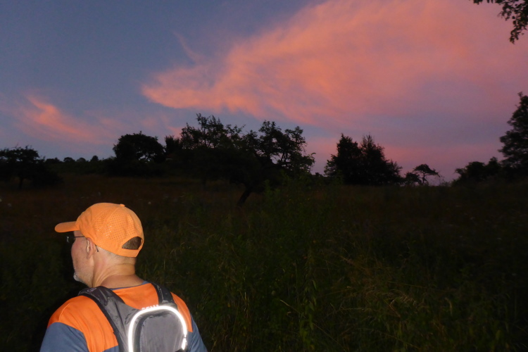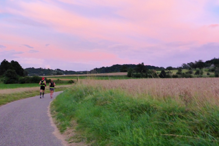 Es geht steil bergauf, anschließend durch den Wald ebenso steil bergab und dann länger auf einem Weg an der Straße entlang. Die nächste VP und gleichzeitig der Wechsel der Zweierstaffel finden wir vor Knittlingen. Nach einer ausgiebigen Stärkung geht es in den Ort hinein. Wie immer muss man den Verkehr beachten. Das ist aber kein Problem. Durchs Wohngebiet von Knittlingen laufen wir bergauf. Wieder auf der Höhe angekommen, geht jetzt die Sonne unter. Fasziniert beobachten wir das Schauspiel. Wir verfolgen ein belgisches Ehepaar. Der Ehemann hat uns eine ganze Weile Gesellschaft geleistet und ist nun auf seine Frau aufgelaufen.