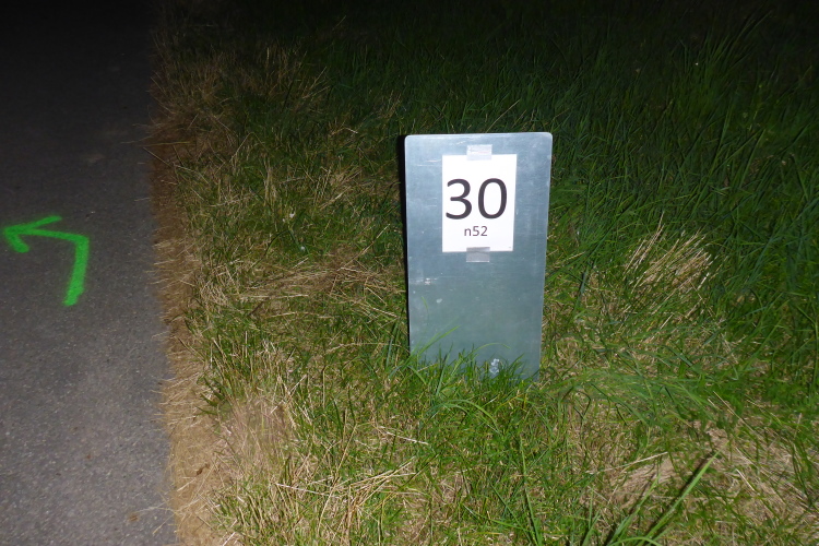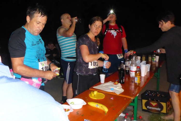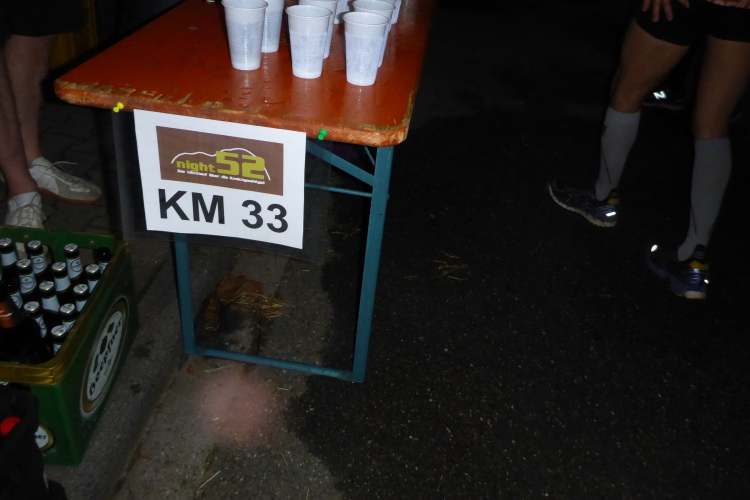 In Großvillars sind trotz Dunkelheit einige Passanten unterwegs. Eine Familie verteilt Wasser. Vielen Dank. Etwas später wären wir fast wären falsch gelaufen, aber die Markierungen sind so eindeutig, dass wir sie nach kurzer Suche wiederfinden. Bei km 33, oder ist es schon 34, erreichen wir die nächste VP. Hier ist die Stimmung ausgelassen, es gibt Bier. Wir machen wieder eine längere Pause und holen jetzt unsere Lampen aus dem Rucksack.