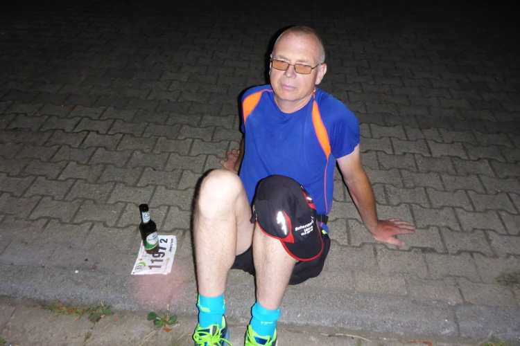 Auf dem Gefälles hat er mich aber schnell eingeholt. Dann stutzen wir. Wo sind die Pfeile? Die VP lag am Ende eines Begegnungsstücks; kann es richtig sein, dass wir so weit zurück müssen? Da taucht vor uns eine bekannte Gestalt aus dem Dunkel auf: Joe, Marathon4you-Kollege, ist der Retter in der Not. Er kennt die Strecke und meint, bei der ersten Laterne hätten wir abbiegen müssen. Er bringt uns sicher zum Abzweig, um nun seinerseits die VP anzusteuern.