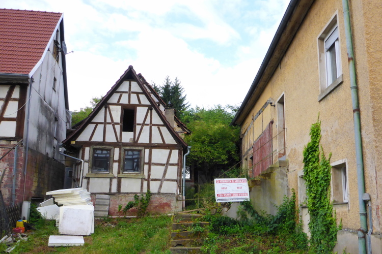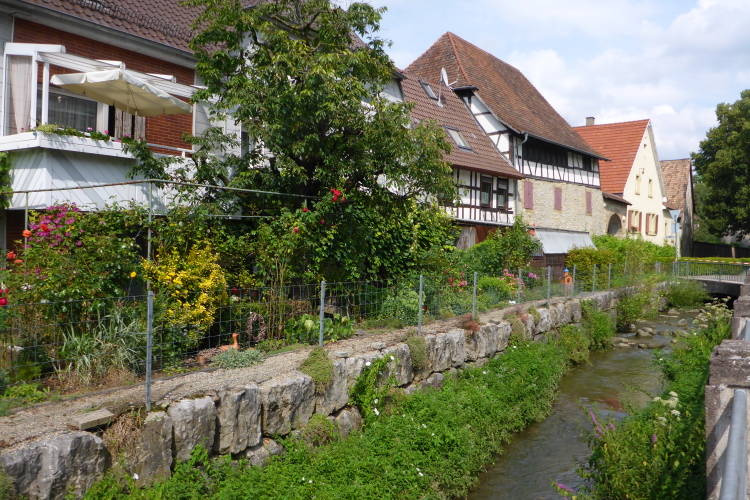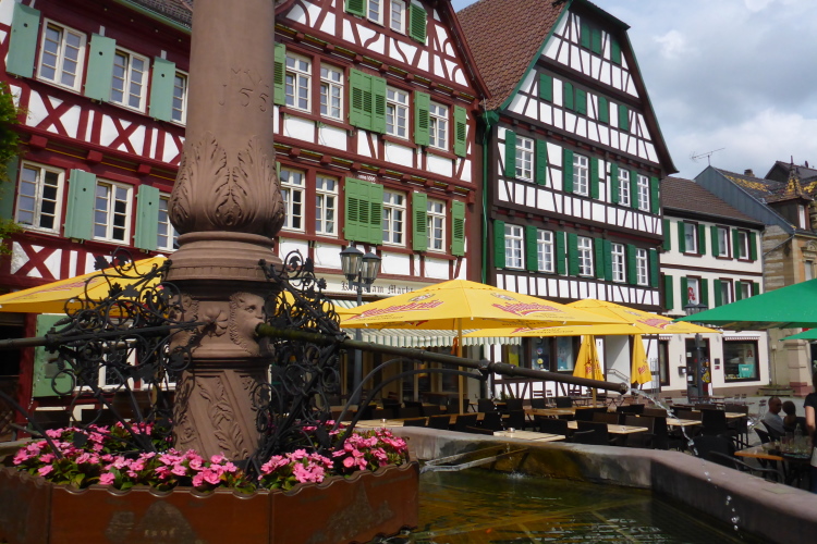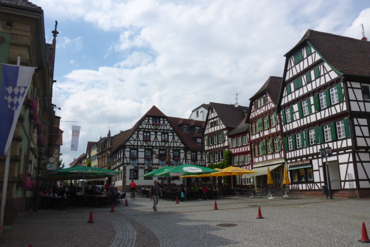 Die Fachwerkhäuser sind wunderschön, sie wurden von Waldensern, einer protestantischen Konfession, gebaut. Sehr schön ist das restaurierte Waldenserhäusle (1864), in dem leider auch keine Gaststätte, sondern ein Museum ist. Der VP ist zum Glück kein Museum, Oli hat eiskaltes Bier und eiskalte Cola spendiert. Dazu ein paar Salzstangen, und es geht mir schlagartig besser. Wen wundert´s? Ich bin zurück, kann wieder laufen.
