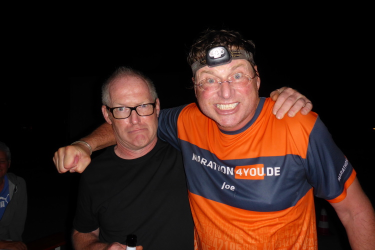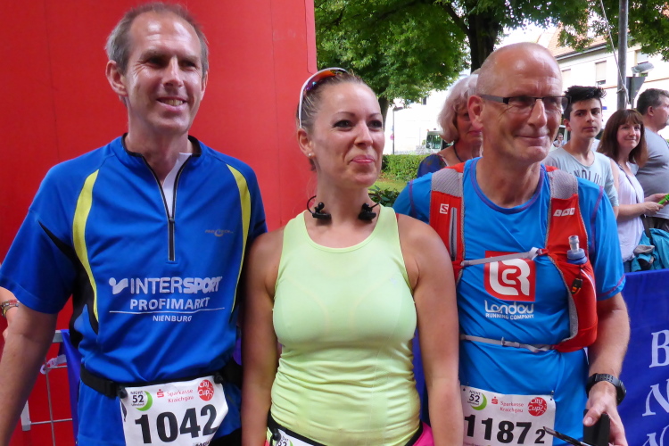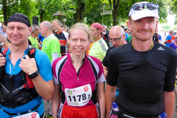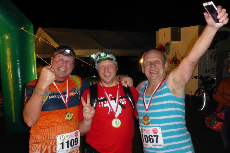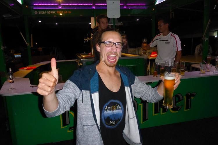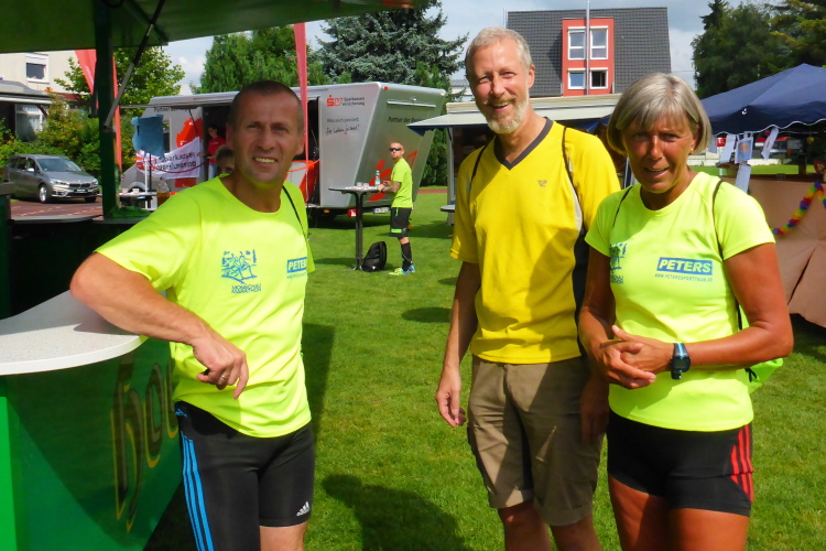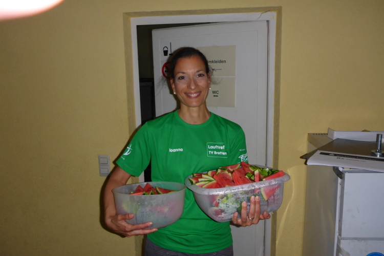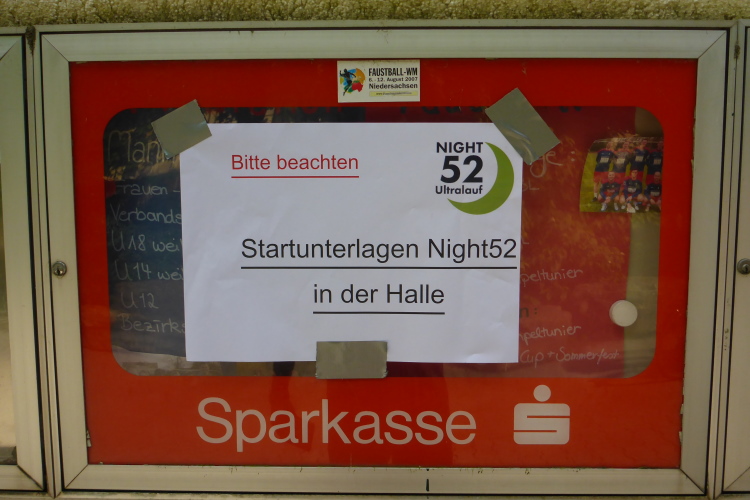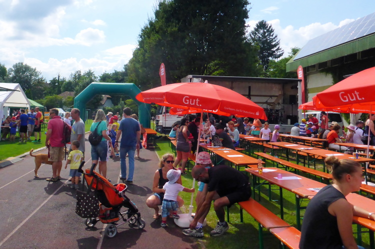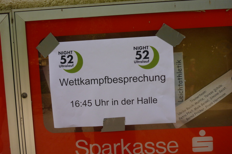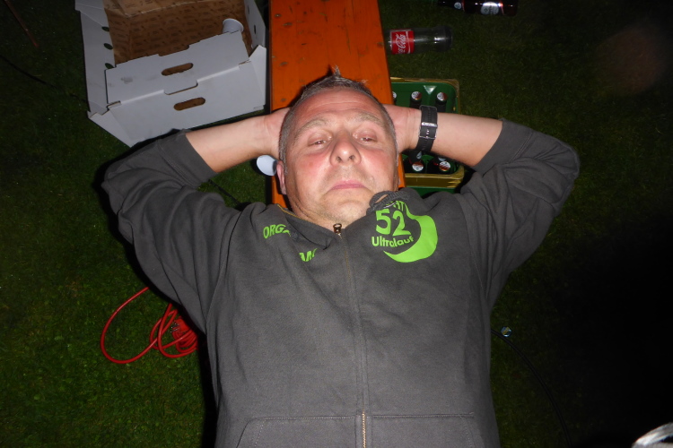 In der Sporthalle kann man sich umziehen und trockene Kleidung für die After-Race Party lagern, oder auch schon seine Schlafmatte ausbreiten. Auf dem Sportplatz gibt es Kuchen, Steaks, Bratwürste und Bier, dann läuft man um 17:45 mit vollem Bauch los.