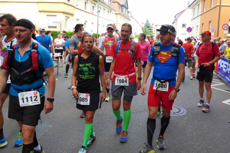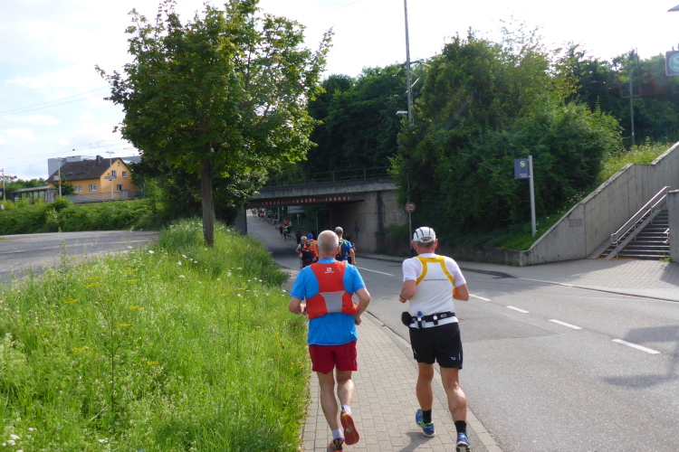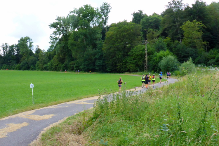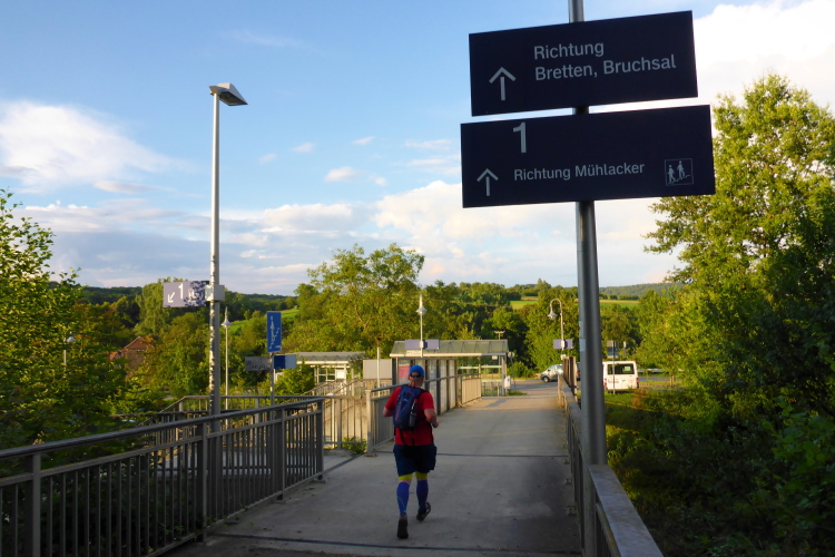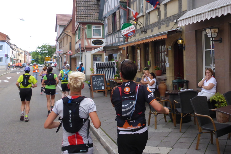 Nach 15 Kilometern kommen wir nach Bauschlott, das letzen Monat schwer überschwemmt wurde. An mir läuft das Wasser runter, die Gaststätte vom 1.FC Bauschlott bietet Abhilfe. Wie jedes Jahr fallen den beleibten Altfußballern die Gläser aus der Hand, wenn sie registrieren, dass es einen Läufer gibt, der ganz normal ist.