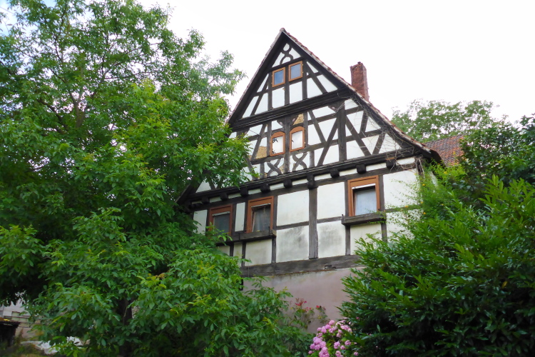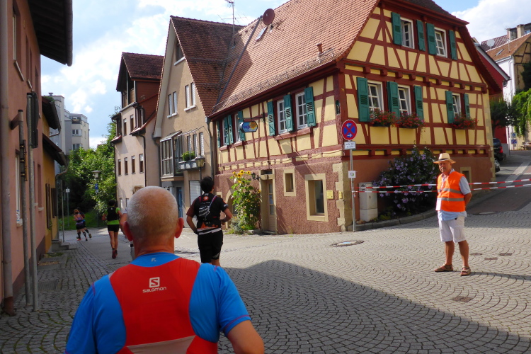 Getränke gibt es am ersten VP (km 7) in Sprantal, aber ich habe Magenstau. Sprantal, das registriere ich noch, ist ein kleines Örtchen, das uns zunächst mit hübschen Einfamilienhäusern begrüßt, dann mit einer Reihe uralter Bauernhöfe mit wunderschönem Fachwerk. Das jeweile Wohngebäude ist meistens erhalten geblieben, aber die hinten liegenden Stallungen und Wirtschaftsgebäude sind dem Verfall überlassen. Genau wie ich jetzt.