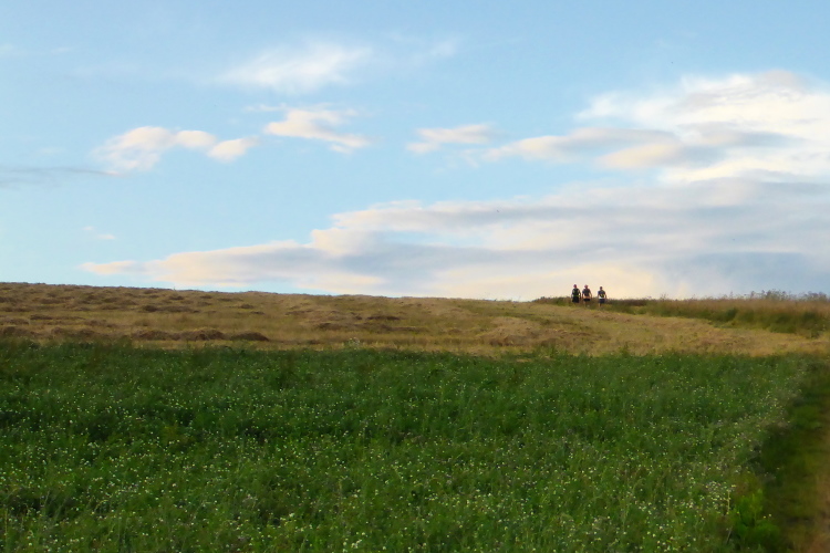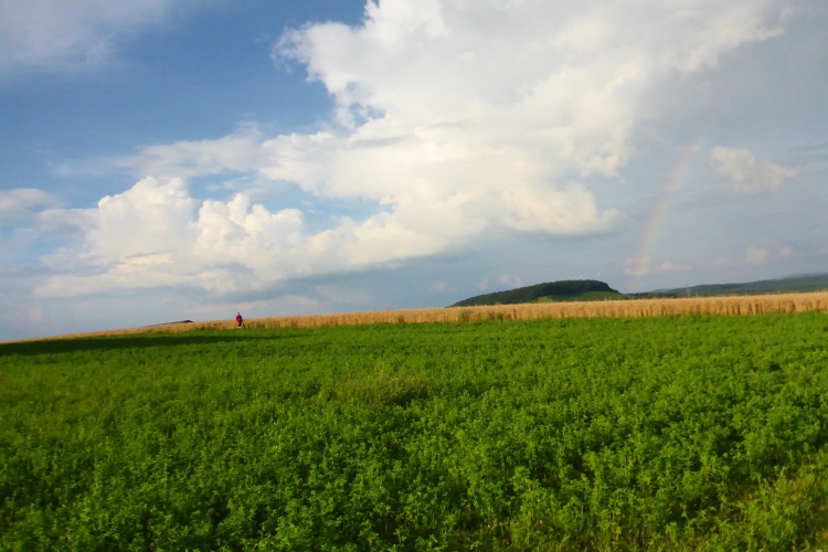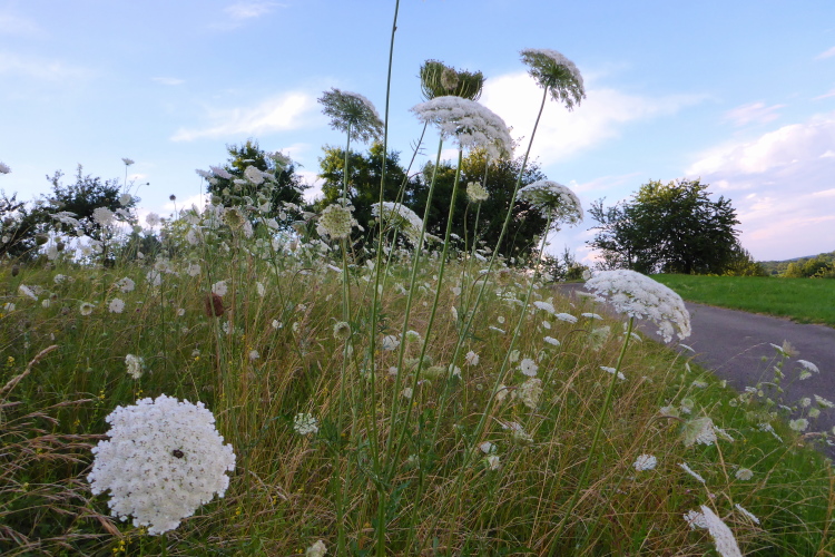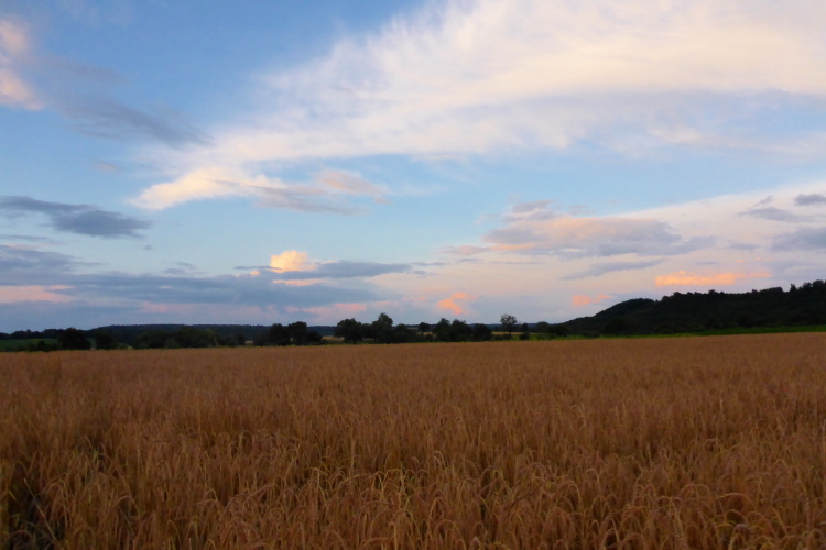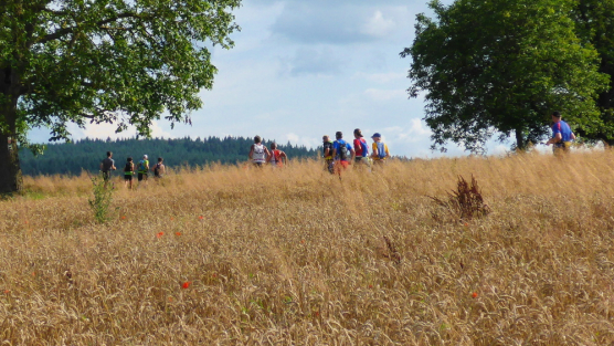 Mir klebt schon der Schweiß, in den Feldern steht jetzt die Hitze. Nicht ein Windhauch liefert Kühlung. Gerhard hat wegen „extremer Unwettergefahr“ die Teilnahme am Lauf abgesagt, aber es gibt sehr viele Nachmeldungen, sodaß es auch ohne ihn einen Teilnehmerrekord gibt. Es wird aber auch einen neuen Abbrecherrekord geben. Ich muss auch brechen, ins Gras, auf die Zecken. Die Bratwurst ist schuld.
