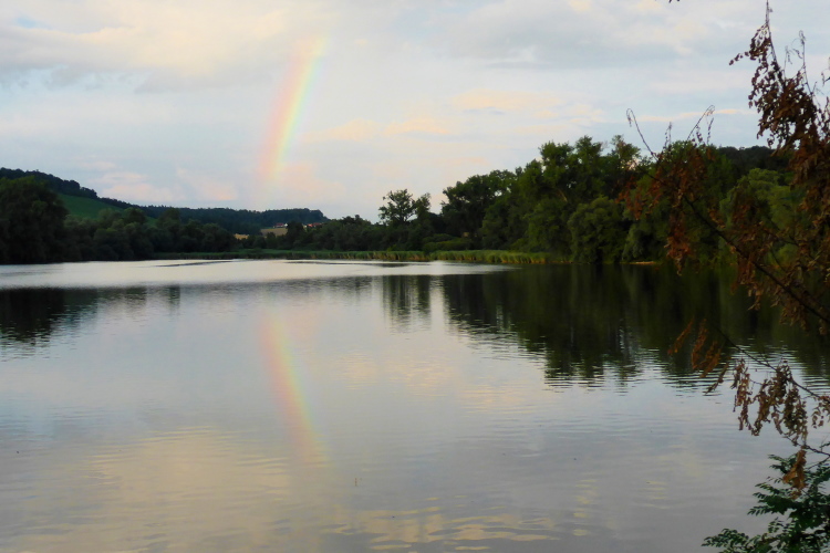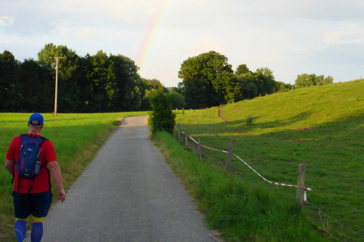 Ein kleiner Regenbogen grüßt aus einer fernen Wolke. Er zeugt von der unglaublich schwülen Luft. Bei km 20 gelingt mir ein Superfoto mit dem Bogen, wie er sich im Aalkistensee spiegelt.