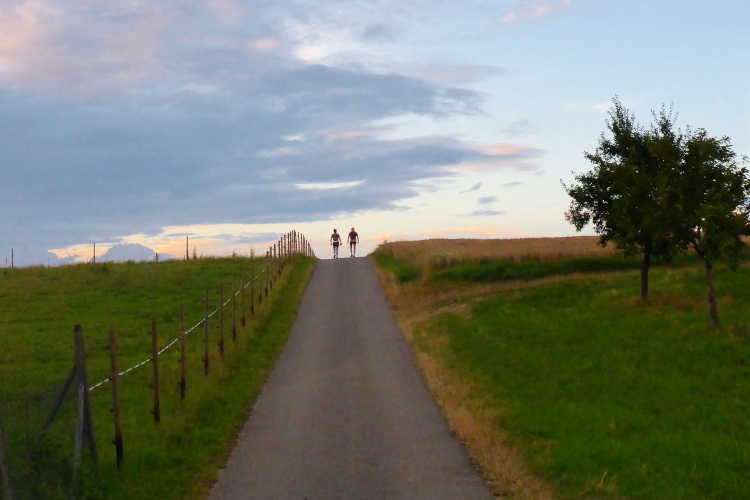 Das Örtchen Nußbaum ist älter, es gibt römische Siedlungsreste. Unterhalb des Pfarrhauses geht’s zurück in die heissen Felder. Der alte Hohlweg ist nur noch am Strassennamen zu erkennen. Nichts prägt den Kraichgau so, wie seine Hohlwege, Jahrtausende alte Handelswege, die sich metertief in den Lößboden gefräst haben. Es sind gerade in der Nacht schaurig schöne Biotope, mit Fledermäusen und und fetten Käfern, die in das Licht der Stirnlampe fliegen. Einst waren diese Wege mit Baumstämmen gegen Raubüberfälle überdacht, nun schweben Glühwürmchen, Feuerwerk und Wetterleuchten über diesen Wegen.