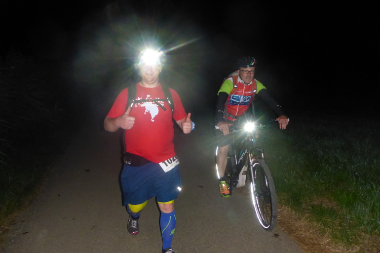 Schnell bin ich in Gölshausen (km 40). Wer nun geradeaus läuft, hat etwa 5 Km abgekürzt und ist vor mir im Ziel, verpasst aber auch den schönsten VP. Es ist der VP von Dirk und Christian, die seit letztem Jahr hier den Verpflegung sponsorn. Die Brüder machen Metallbau, Sonnenschutz und diese Riesenparty im Zuge des Night52. Um diese Uhrzeit sind die Dorfältesten schon im Bett, aber das Jungvolk knutscht noch. Wer nichts zum Knutschen hat, spielt Fußball vor der Werkshalle oder riecht nach Ultra.