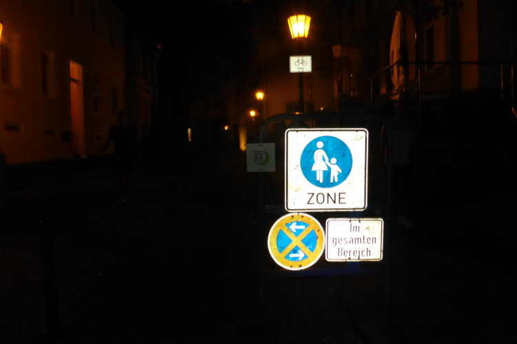 Theoretisch kostet der Parkplatz Geld, aber die Software will nicht und die Schranken fallen runter. Nur die im barrierfreien Asphalt eingelassenen Lampen funktionieren. So würden auch die Husaren den Weg in die Altstadt finden. Von dort sind es wenige Meter bis zur Withum Sportanlage, die wieder außerhalb der ehemaligen Stadtmauer liegt. Die Sportanlage ist mal nicht nach irgendeinem Bürgermeister benannt, sondern nach den Brüdern Withum, die die Zerstörung der Stadt im Pfälzischer Erbfolgekrieg dokumentiert hatten.