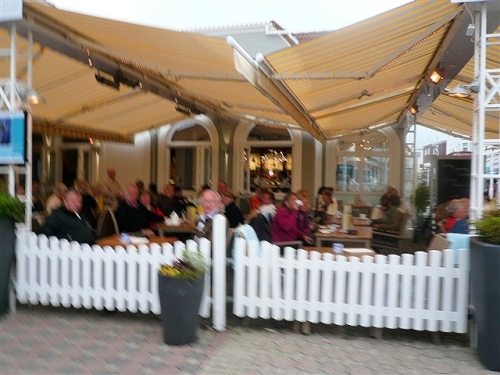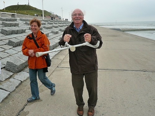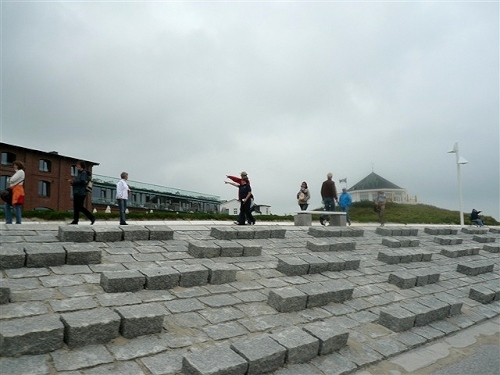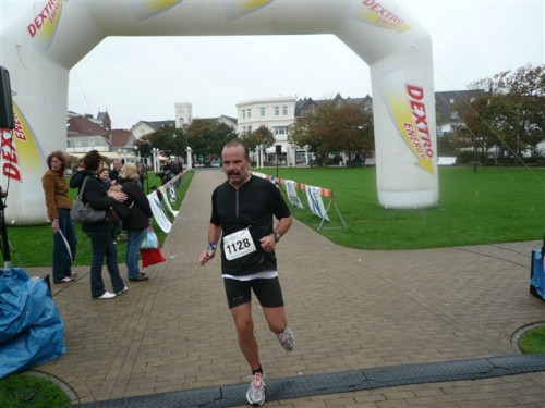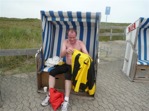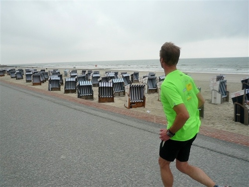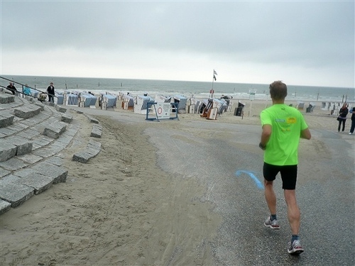 Beim 14. Km sind wir wieder in der Stadt, d.h. laufen zwischen wohl überwiegend Ferienhäusern und dem Deich entlang. Eingangs hat der ausrichtende TuS Norderney einen Strandkorb aufgestellt und Opa Hein läutet eine kleine Schiffsglocke. Ein Schaulaufen gibt es dann ab km 18 auf der Strandpromenade, wo nicht mit Beifall gegeizt wird. Hartmuts bessere Hälfte Sonja („Hallo, Schatz!“) knipst uns eingangs. Ein alter Mann auf Krücken hat die Hände nicht frei und „klatscht“ mit seinen Gehhilfen. Klar, daß er sofort abgelichtet wird. Spaziergänger, Surfer, Strandkörbe - Inselidylle pur bei allerdings steigerungsfähigem Wetter. Anstrengend empfinde ich das Laufen auf der schiefen Promenade, mein linkes Bein müßte zum Ausgleich ein paar Zentimeter kürzer sein.
