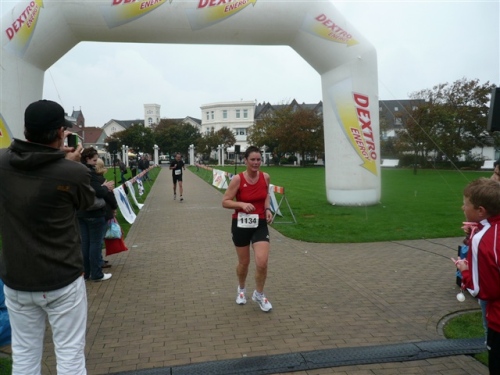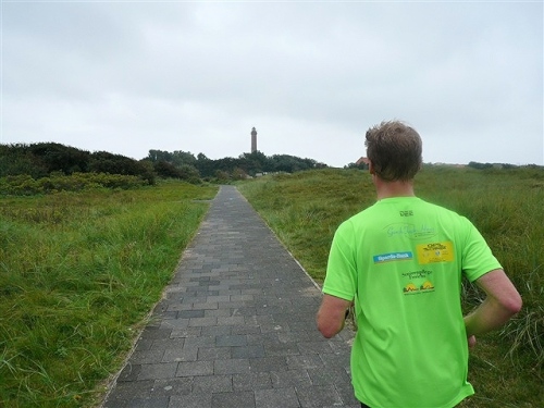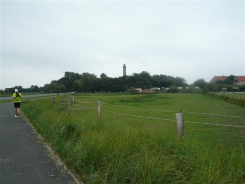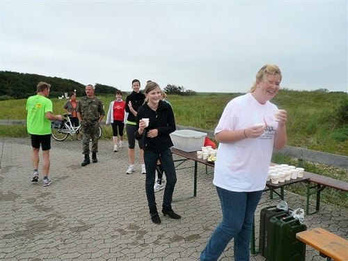 Bei km 9 ist die zweite von 5 Verpflegungsstellen, die mit Wasser, Iso, später Cola, Äpfeln und Bananen absolut ausreichend bestückt sind. Sehr nette freiwillige Helfer (v.a. –innen!) machen jeden kurzen Stop zu einem Ereignis. Auf dem Rückweg kommen wir zunächst recht nahe am Norderneyer Wahrzeichen, dem Leuchtturm, vorbei. An dessen Südseite liegt der kleine Inselflughafen, wo wir im Vorbeilaufen einige Starts bzw. Landungen erleben können.