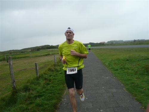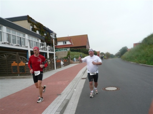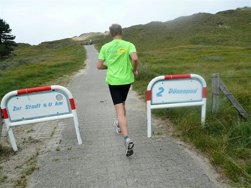 Inzwischen wird es ganz einsam. Vor mir passiert nichts Kriegsentscheidendes, hinter mir auch nicht, zumindest läuft niemand auf mich auf. Und so spule ich km für km ab. Und komme tatsächlich so gegen Anfang der 30er km Hartmut wieder näher. Aha, anfangs zu ehrgeizig gewesen, wußte ich’s doch. Vor ihm läuft ein weiterer Kamerad, beide überhole ich gleichzeitig. „Ah, Du bist wieder da!“ „Gehirn ausschalten und dranhängen!“. Das aber klappt nicht so, wie gewollt. Bei mir geht es wieder gut und so starte ich erneut, diesmal einsam, in die Dünen.