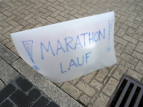 Der 21. km führt dann wieder in die Innenstadt und auch bald zum Veranstaltungsgelände. Hartmut und ich werden namentlich begrüßt, durchqueren erstmals den Zielbogen, das Jubelvolk ehrt uns und schon sind wir auf der zweiten Runde. Hartmut ist verflixt schnell und nicht zum ersten Mal weise ich ihn auf km-Zeiten von wenig über 5 min. hin. Nach etwa weiteren 10 min. lasse ihn dann langsam ziehen. An der gleichen Stelle wie auf der ersten Runde reduziere ich nochmals mein Gewicht ein wenig und danach ist er weit voraus. So wirklich zieht er aber nicht davon und bleibt in meinem Blickwinkel.