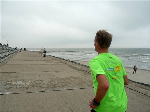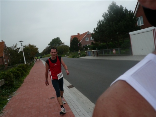 Auf dem langen, geraden Deichabschnitt zwischen ca. km 6 und 9, der an den Salzwiesen vorbeiführt, vernehme ich über eine lange Zeit Schritte unmittelbar hinter mir. Noch während ich mir überlege, ob mir das auf die Dauer auf den Geist geht, schließt der Läufer auf. Der waschechte Ostfriese Hartmut mit ortstypisch rollendem „r“ entpuppt sich schnell als nette Laufbegleitung und gemeinsam quatschend bleiben wir zunächst zusammen. Er hat bei seinen insgesamt acht bisherigen Marathons hier eine 4:00 und 4:03 stehen und will endlich die 4 Stunden knacken. Wir laufen in Richtung 3:45 und ich befürchte, daß er zu schnell ist. Er aber läßt sich nicht beirren und hält das Tempo vergleichsweise hoch.